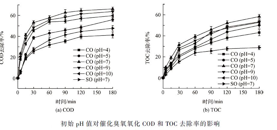 由圖1可知,催化臭氧氧化(catalytic ozonation,CO)的COD 去除率可以達(dá)到(66. 2 ± 1. 7)% ,比單獨(dú)臭氧氧化(single ozonation,SO) 的(47. 6 ± 2. 6)% 提高了近20 個(gè)百分點(diǎn);而TOC 去除率則可以達(dá)到(58. 4 ± 2. 1)% ,比單獨(dú)臭氧氧化的(28. 8 ± 1. 9)% 提高了近1 倍。調(diào)節(jié)廢水pH 值,無論是酸性(pH = 4,5),還是堿性(pH = 9,10),催化臭氧氧化的效果都不如中性(pH = 7)的效果好,這可能是因?yàn)榱u基氧化鐵的零電荷點(diǎn)(pHpzc )在中性附近,過酸和過堿都影響了羥基氧化鐵表面羥基的電荷形態(tài)。需要注意的是:當(dāng)pH = 4 時(shí),COD 的去除率不如單獨(dú)氧化的,但TOC 的去除率卻比單獨(dú)氧化的高。這是因?yàn)閱为?dú)臭氧氧化很難降解煤化工生化出水中的難降解有機(jī)物,從而TOC去除率低;而pH = 4 時(shí)催化臭氧氧化一定程度上降解了這部分難降解有機(jī)物,甚至是難以測出COD 的有機(jī)物,但效果沒有中性和堿性條件下的好,依然有一部分降解不完全,反而被檢測出COD,從而COD 的去除率反而降低。