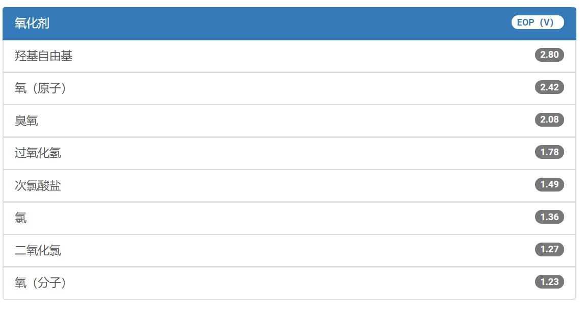 高級氧化工藝(AOP)結合了臭氧(O3)、紫外線(UV)、過氧化氫(H2O2))或催化劑提供強力水處理溶液,用于通過COD、BOD或TOC測量的殘余有機化合物的還原(去除)。所有AOP都設計用于產生羥基自由基,正是羥基自由基高效地破壞有機化合物。下圖顯示了羥基自由基與其他氧化劑的氧化能力。