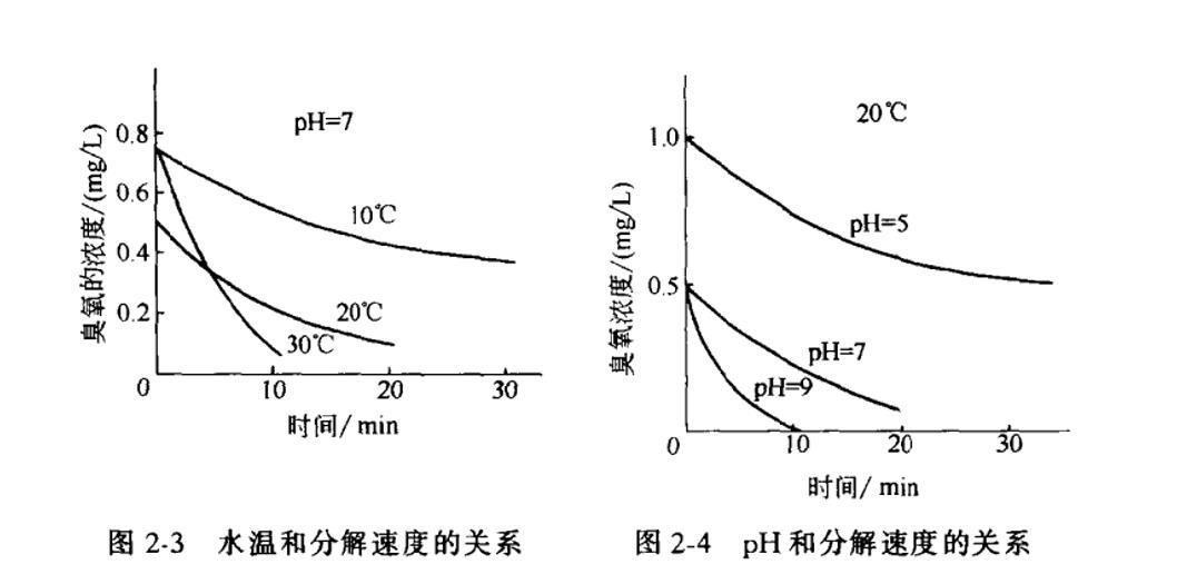 臭氧在水中的分解速度隨水溫和pH值的提高而加快,圖2-3為pH=7時,水溫和分解速度的關系,圖2-4為20℃時,pH和分解速度的關系。