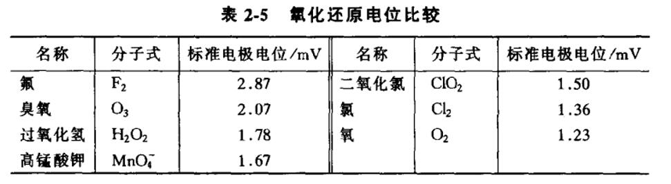 從表2-5可知,臭氧的標準電極電位除比氟低之外,比氧、氯、二氧化氯及高錳酸鉀等氧化劑都高。說明臭氧是常用氧化劑中氧化能力 很強的。同時,臭氧反應后的生成物是氧氣,所以臭氧是高效的無二次污染的氧化劑。