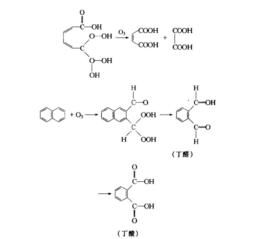 (2)臭氧和芳香族化合物的反應臭氧和芳香族化合物的反應較慢,在系列苯<萘<菲<嵌二萘<蒽中,其反應速度常數(shù)逐漸增大。其反應如下